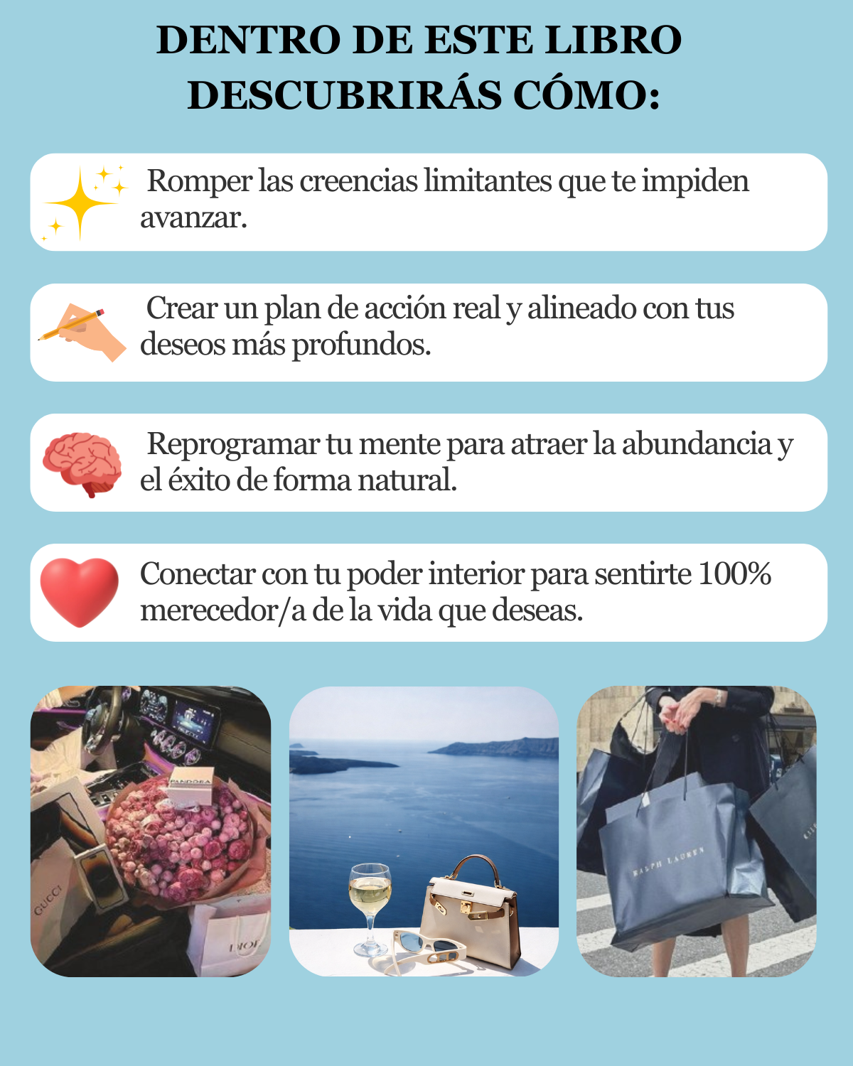 Incluye ejercicios de visualización, afirmaciones, prácticas de gratitud y reflexiones para ayudarte a identificar creencias limitantes y trabajar tu mundo interno.