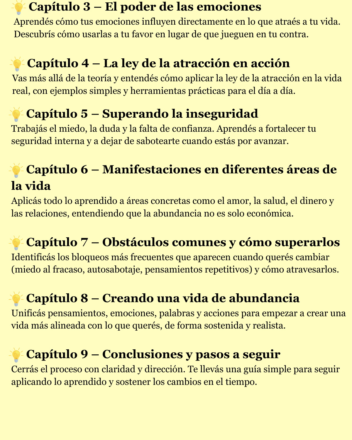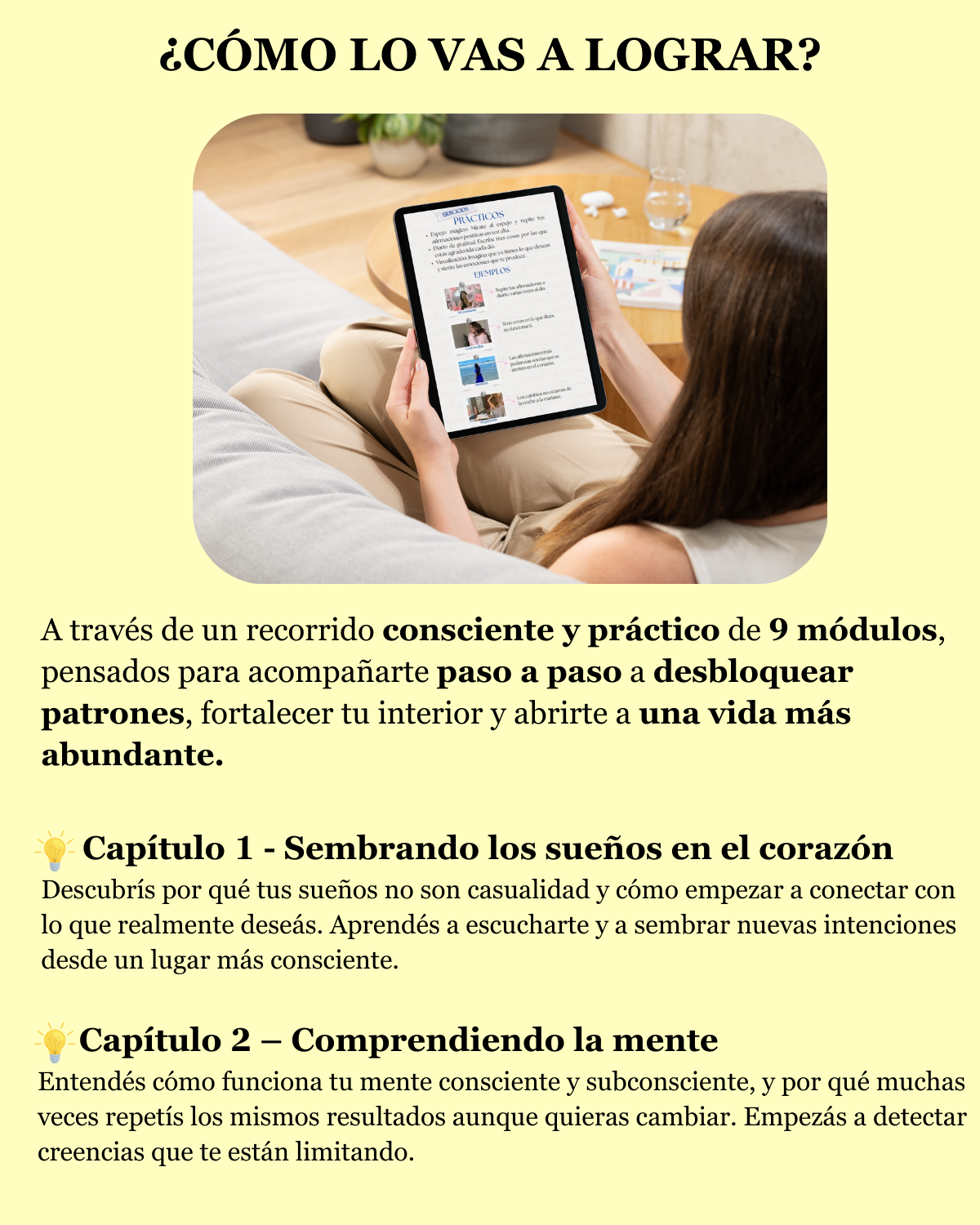 Es un ebook práctico e introspectivo que te guía a cambiar tu forma de pensar, sentir y hablarte para empezar a crear una vida más abundante desde adentro hacia afuera.